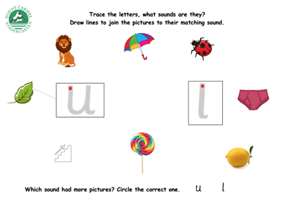 Method | Begin by asking your child to identify each sound and trace them, starting at the red dot. Next, go through the pictures with your child, asking them to name them. They might need help with some of the more tricky ones, eg: ‘upstairs’. Show them the example, you might say something like: “This is a leaf; leaf begins with the sound…(let them say it) so we draw a line to join it to ‘l’”. Let them work through each picture before counting up the u & l words. Ask them to circle which one has more. |
