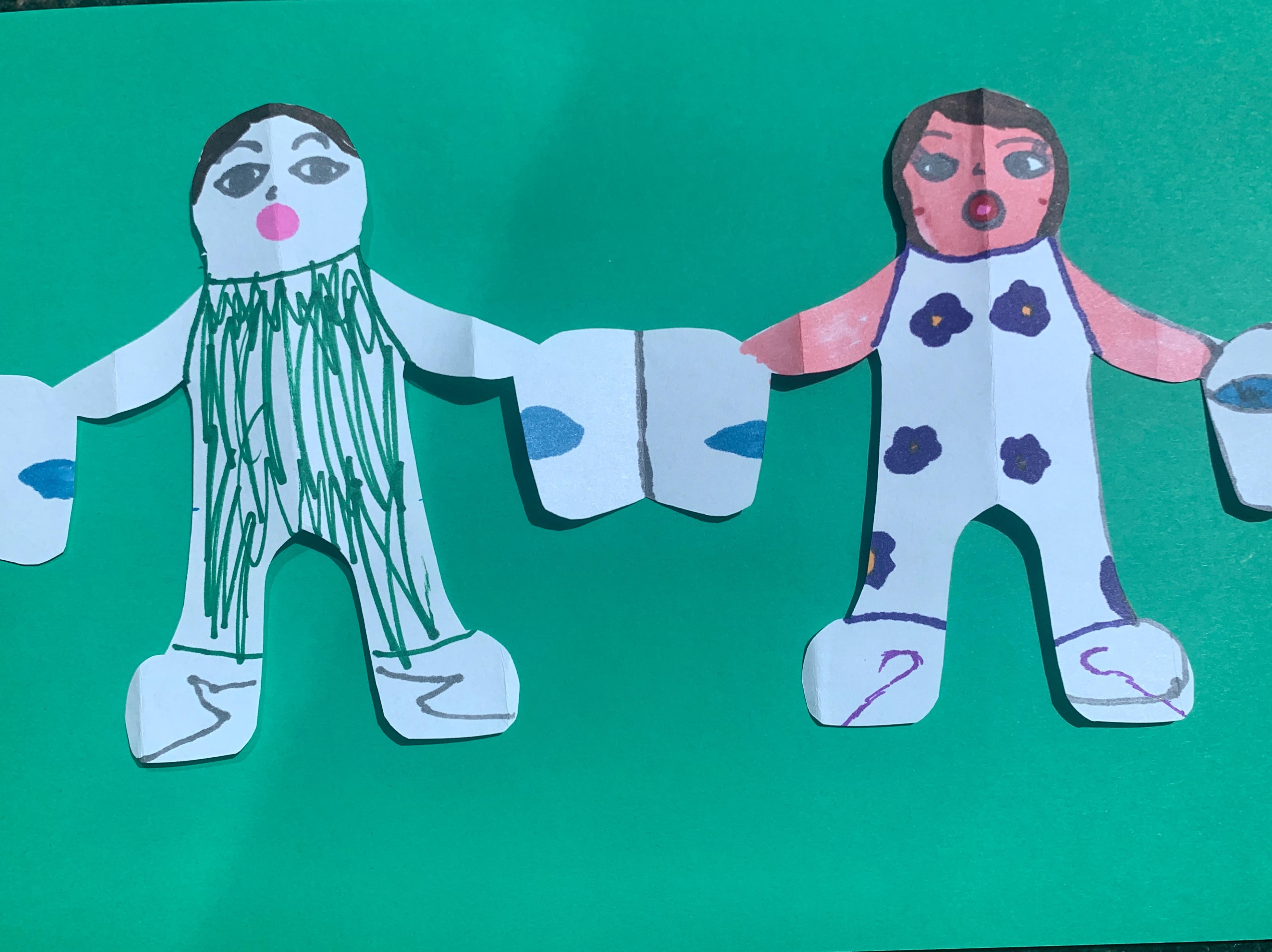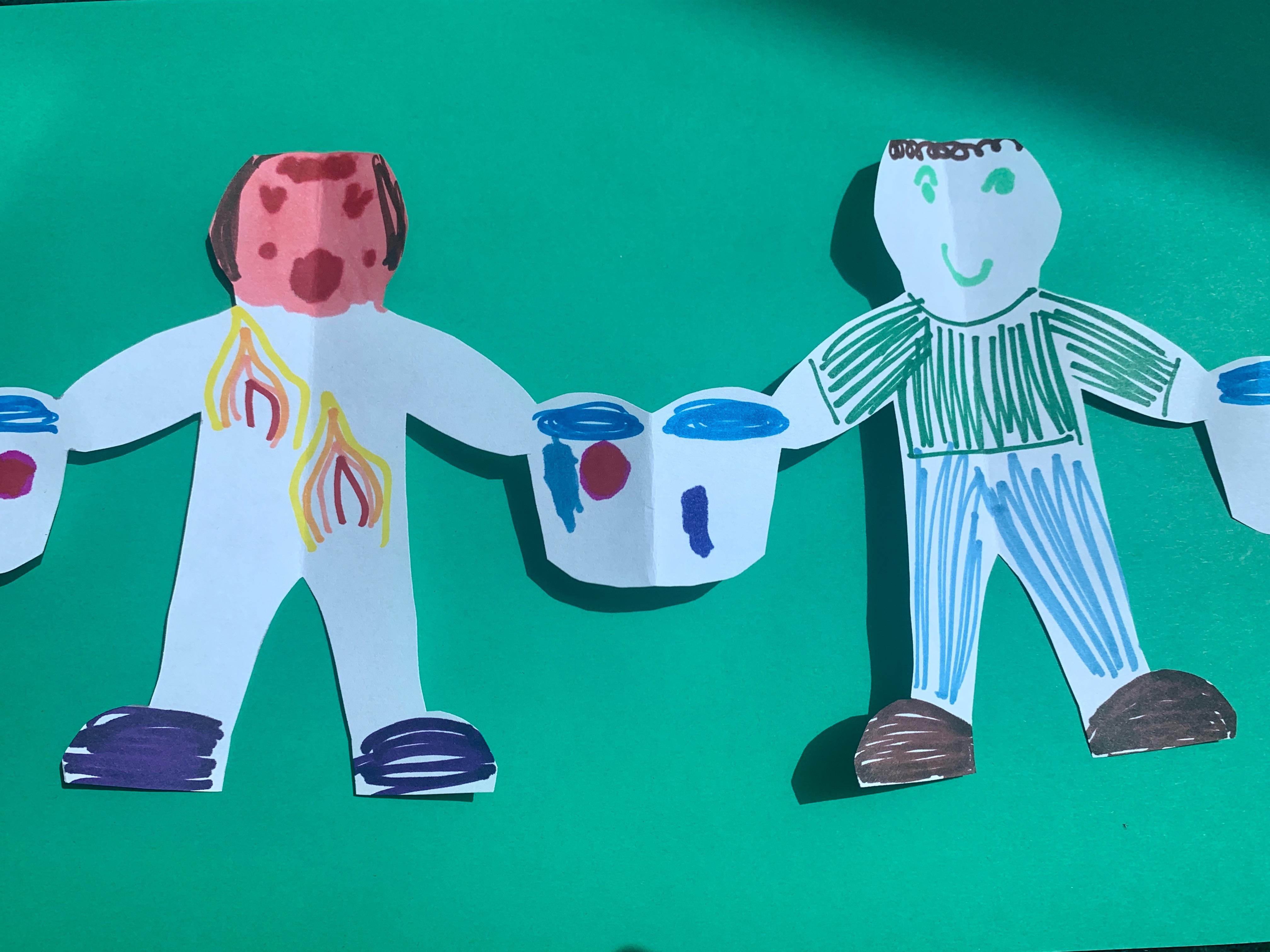 Open up the paper and you will have a chain of people holding buckets ready to fight the fire! Don’t forget to draw faces on them and colour them in! |